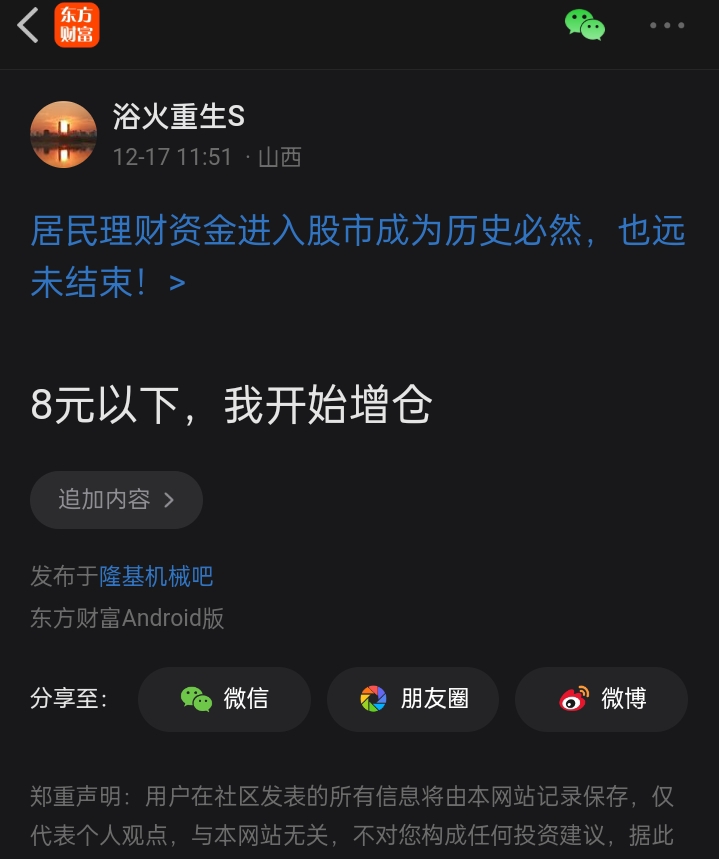 温馨提示: 1.根据《证券法》规定,禁止编造、传播虚假信息或者误导性信息,扰乱证券市场;2.用户在本社区发表的所有资料、言论等仅代表个人观点,与本网站立场无关,不对您构成任何投资建议。用户应基于自己的独立判断,自行决定证券投资并承担相应风险。《东方财富社区管理规定》