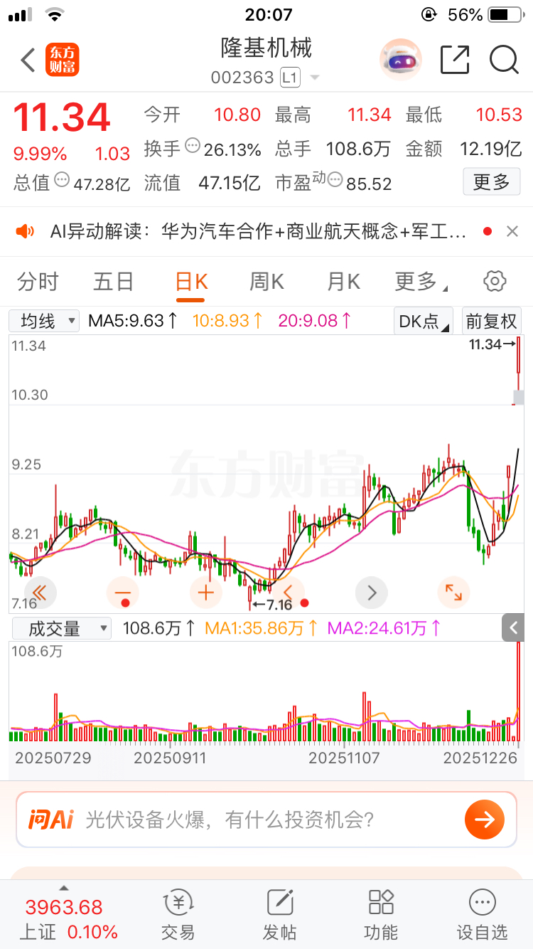 $隆基机械(SZ002363)$ 明天会跌停吗???一字板后,又来一个巨量封涨板,按以往经验,明天宽幅肯定少不了,有些还会先涨5%再到跌停,尾盘又拉红5%,周二再选方向,是继续往上连板?还是A形往下,周二才有答案。最理想的就是明天来个缩量一字涨停板。祝祝发财,点赞的发大财!