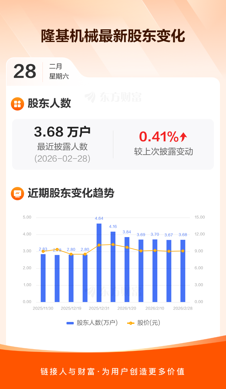 隆基机械:截至2月28日最新股东户数3.68万户,较上期增加0.41%