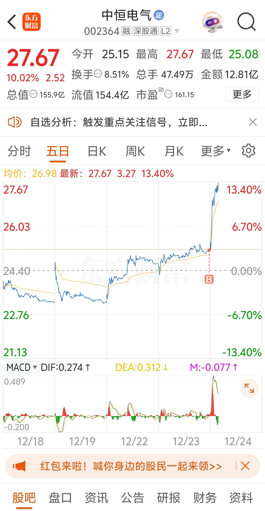 $中恒电气(SZ002364)$ 对它的期望就是一个板,根据以前经验。后面很难连板,但是会震荡上升几天,然后就下行,所以明天如果还涨就可以考虑止盈