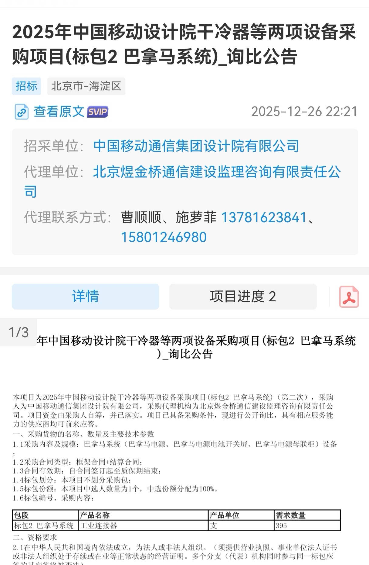 $中恒电气(SZ002364)$ 巴拿马电源今年逐步放量,图取自贴吧里面的好友们,中国移动、中国电建、万华化学开年连中三标,按dpsk说的一套280但是应该没有那么多,可能50-60w,那中国移动那个395套都有两个亿收入了大概。