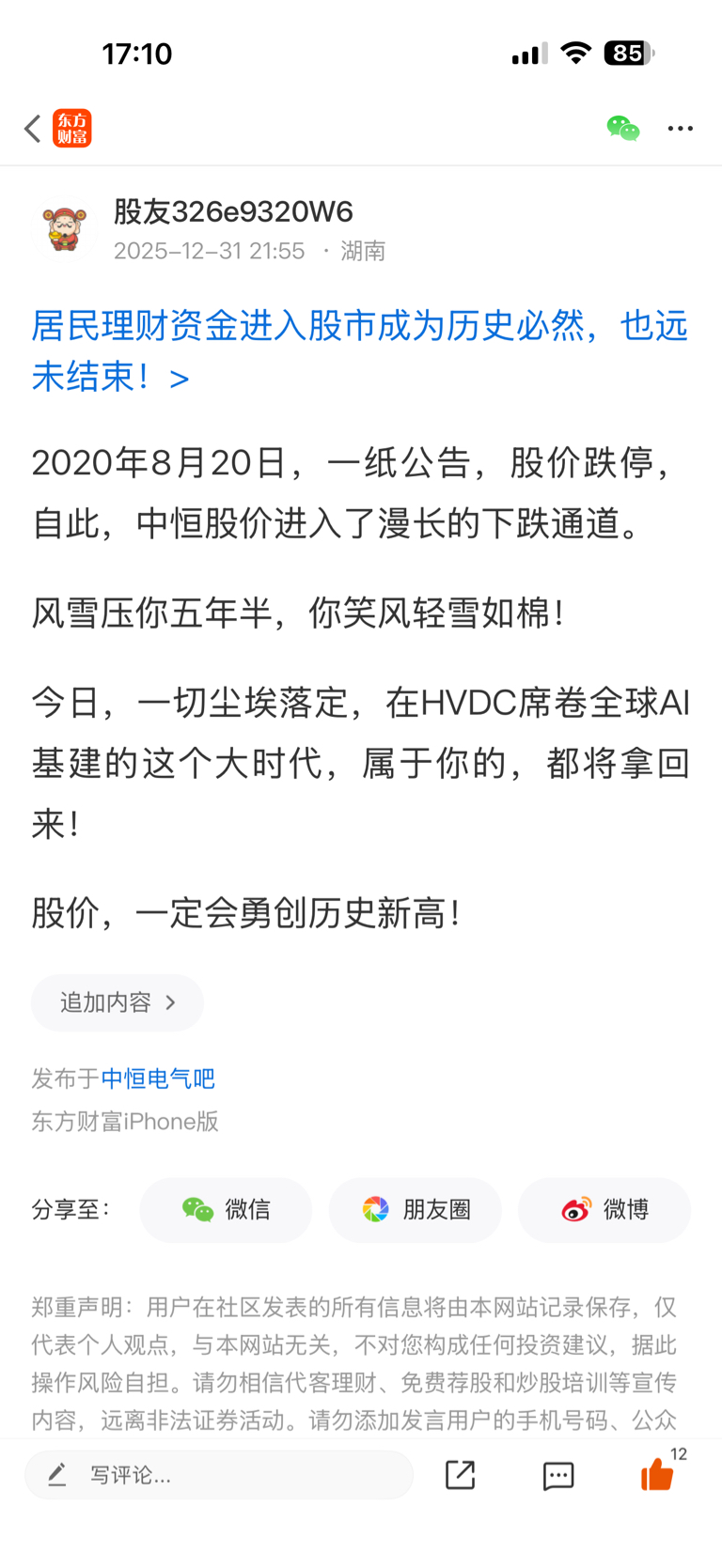 温馨提示: 1.根据《证券法》规定,禁止编造、传播虚假信息或者误导性信息,扰乱证券市场;2.用户在本社区发表的所有资料、言论等仅代表个人观点,与本网站立场无关,不对您构成任何投资建议。用户应基于自己的独立判断,自行决定证券投资并承担相应风险。《东方财富社区管理规定》