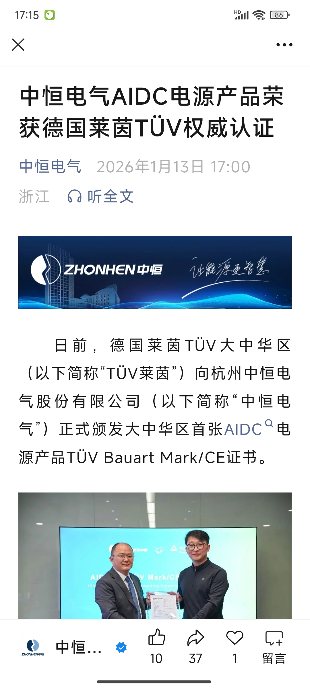 $中恒电气(SZ002364)$ 中恒电气AIDC电源产品荣获德国莱茵TÜV权威认证