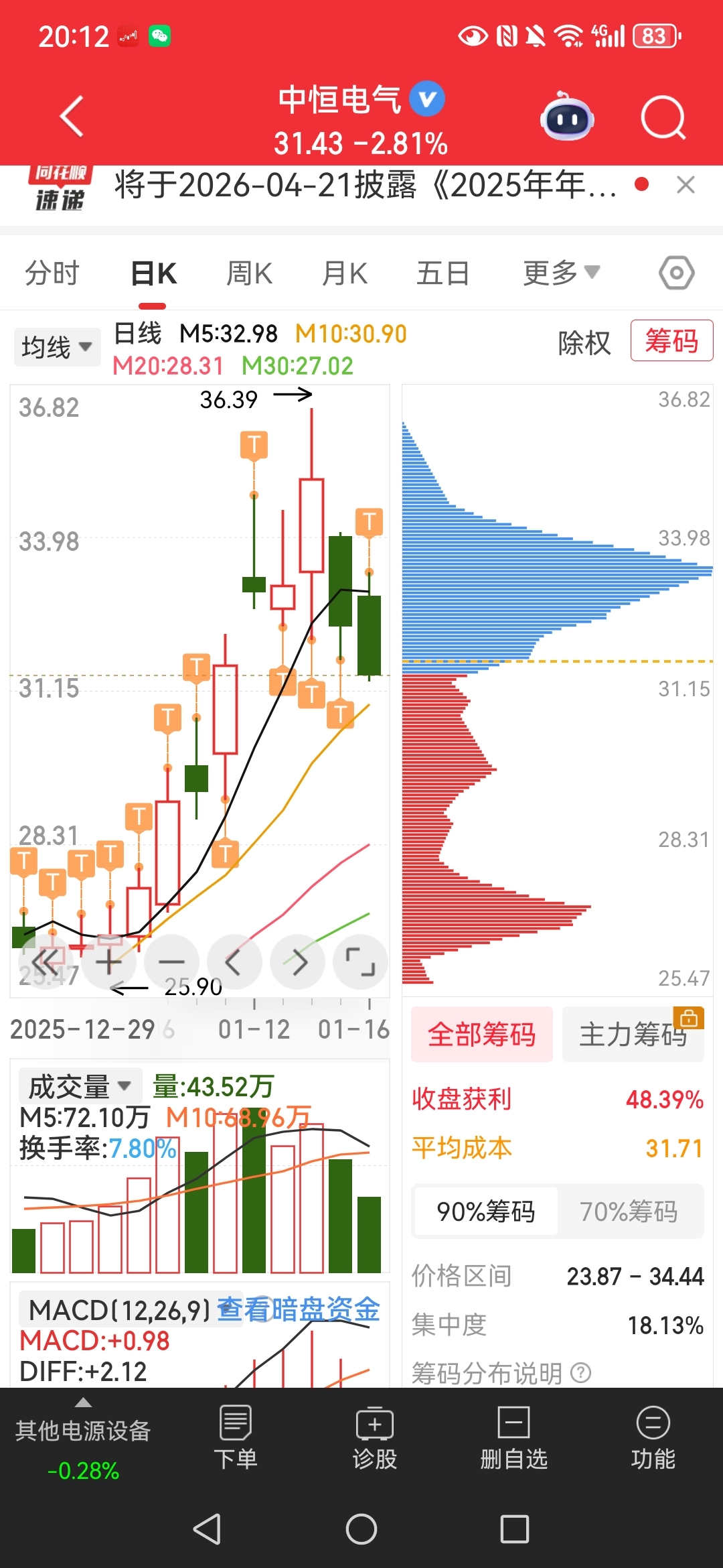 $中恒电气(SZ002364)$ 我的由负到正到不能贪了!我是26入的十手,后来慢慢补,一路补补一路绿,到21多负3W多元,一横心补补满,拉到34点5除了半,前天收看正了10W多,昨天和今天-3W多,先保住利润留10手全出了!这个除了做T,高位守难!