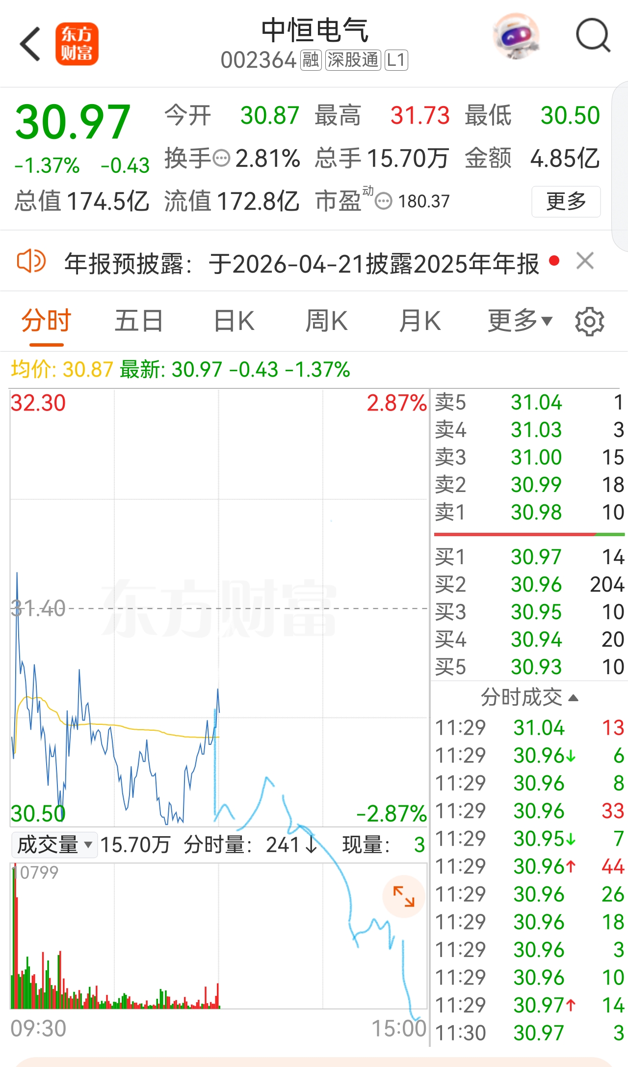 $中恒电气(SZ002364)$ 下午走势