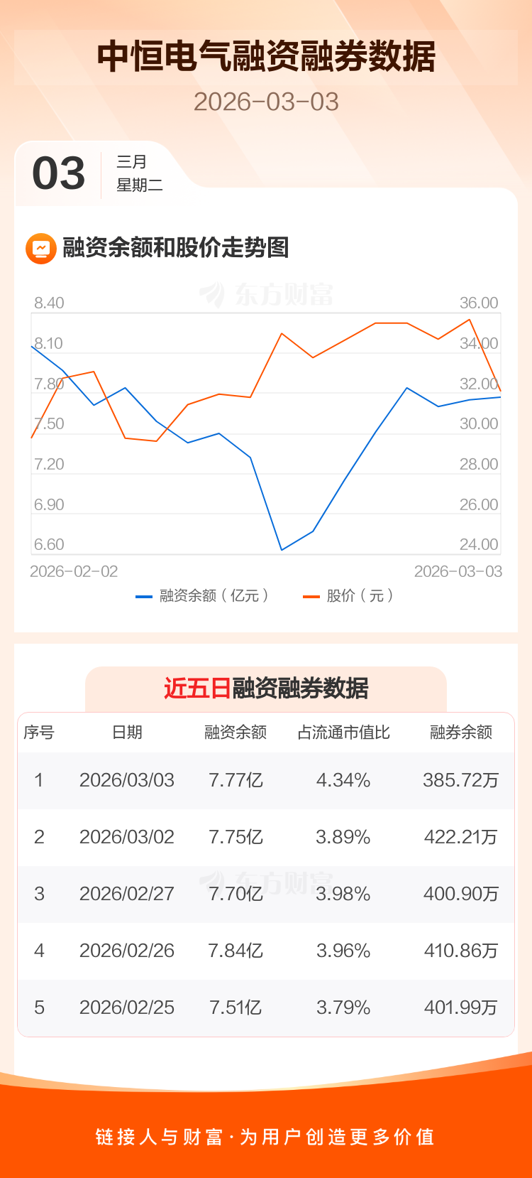 交易所最新数据显示,中恒电气于2026年3月3日获融资买入1.45亿元,融资偿还1.42亿元,当日融资净买入264.91万元。目前,该股融资余额7.77亿,占流通市值比例为4.34%。