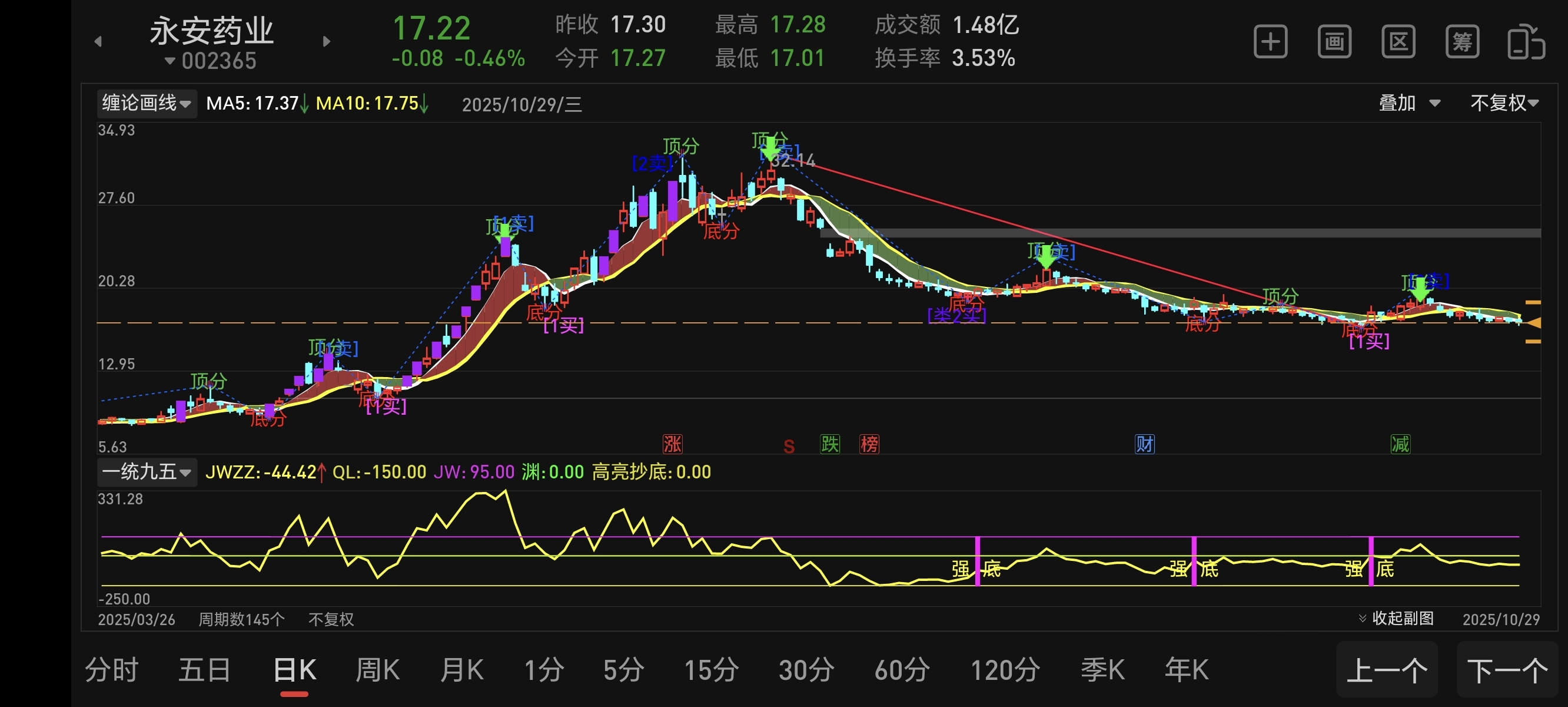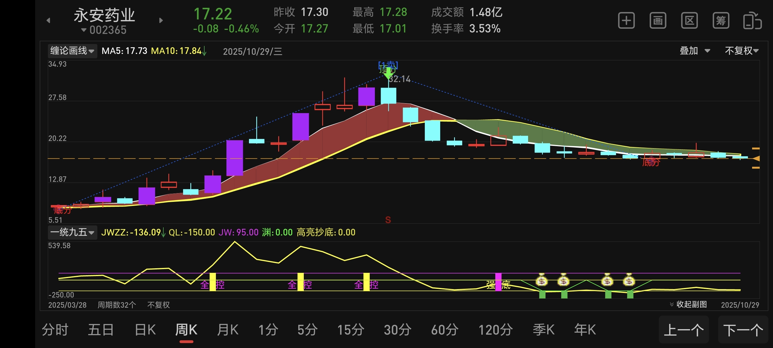 这是周线的走势,必须跌到,日线出现钱袋子信号才能短线买入博个反弹。目前日线还没出