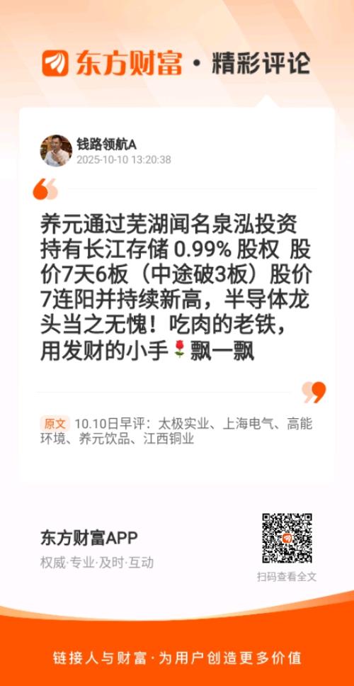 //@钱路领航A :养元通过芜湖闻名泉泓投资持有长江存储 0.99% 股权 股价7天6板(中途破3板)股价7连阳并持续新高,半导体龙头当之无愧!吃肉的老铁,用发财的小手飘一飘 $融发核电(SZ002366)$$大众公用(SH600635)$$深科技(SZ000021)$