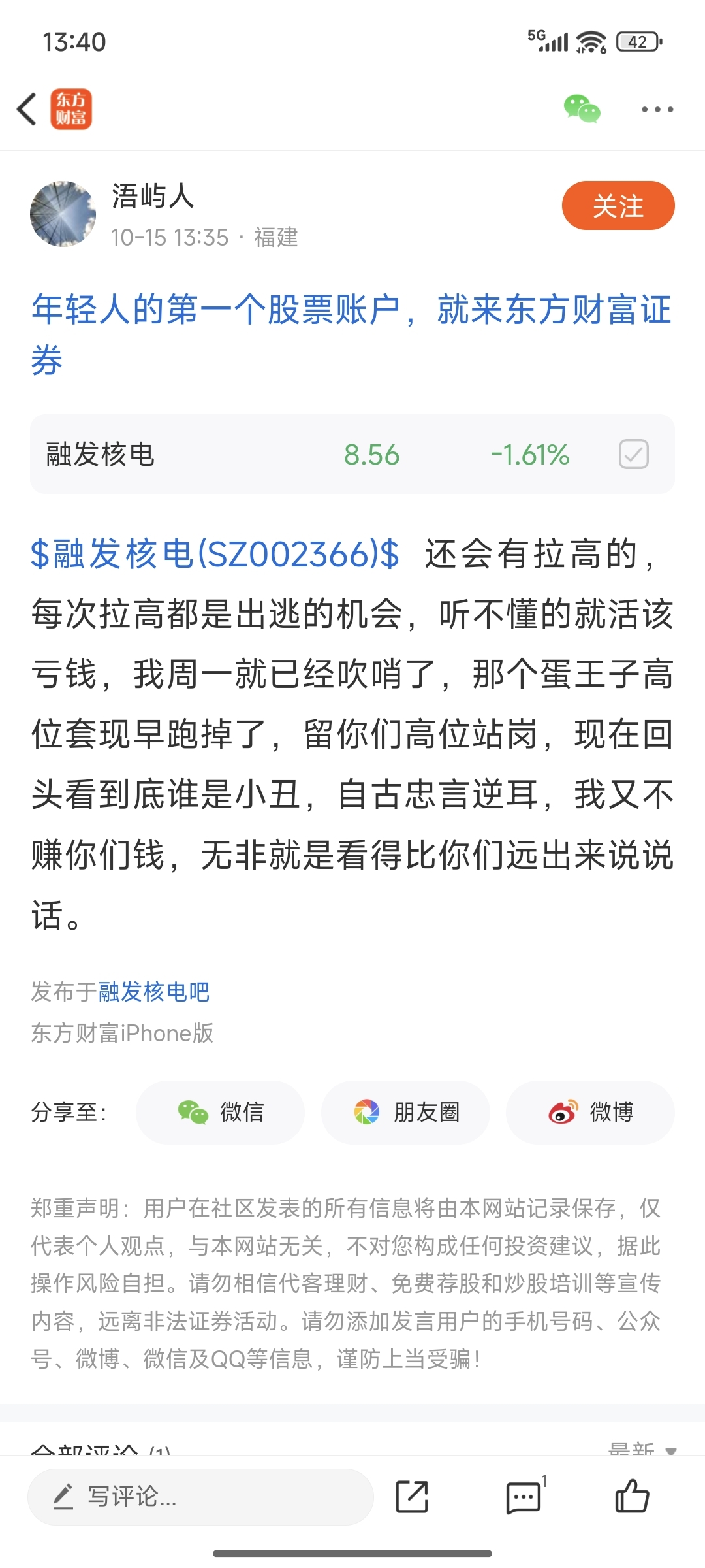 $融发核电(SZ002366)$ 小丑又跳出来了?你8.7就让别人跑路,我9.5让别人走的,你也好意思,可笑,你9.5接了我的盘心里不平衡了?
