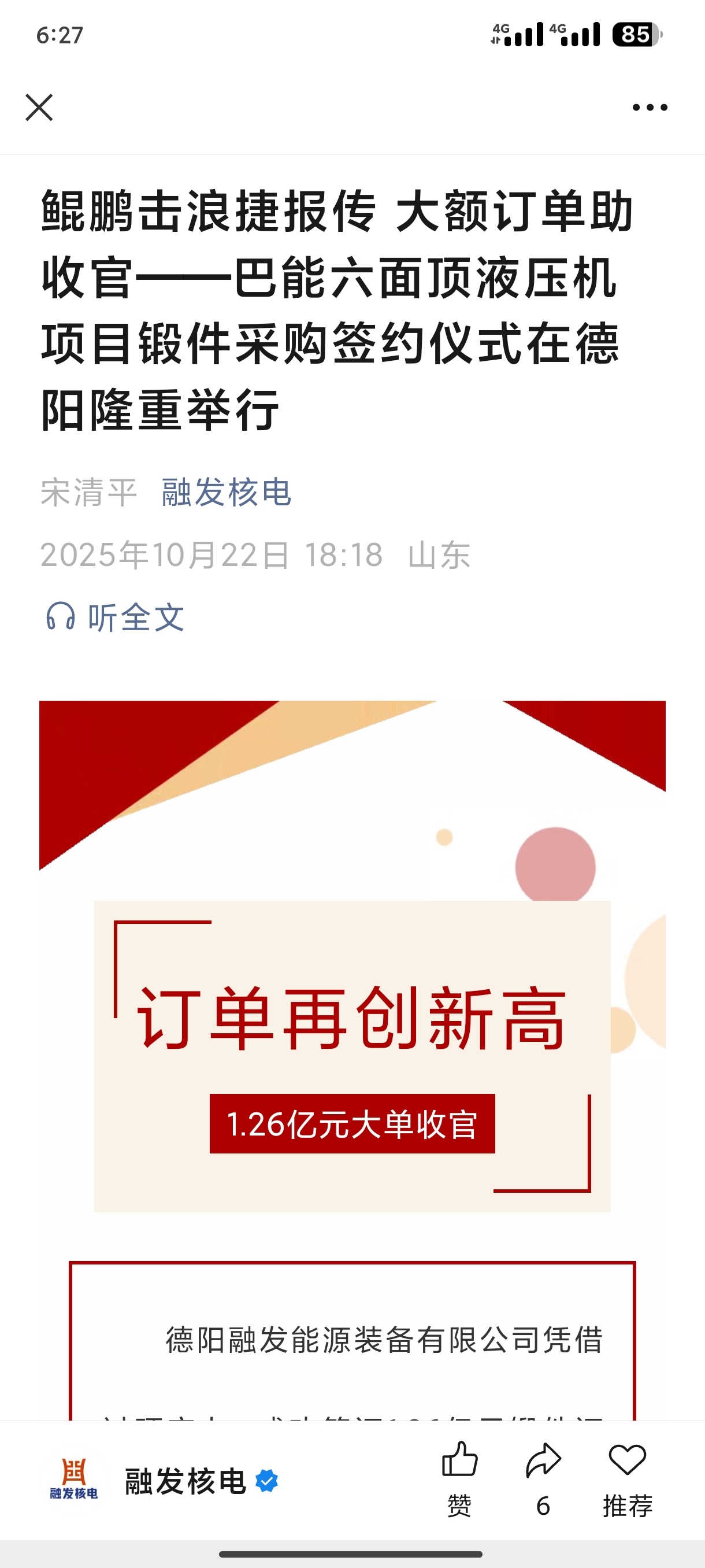 $融发核电(SZ002366)$ 德阳融发能源装备有限公司凭借过硬实力,成功签订1.26亿元锻件订单,不仅刷新历史纪录,更为公司未来发展注入新动力。。。。。是不是割肉割错了