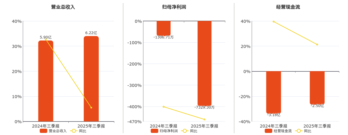 公司营业总收入为6.22亿元,较去年同报告期营业总收入增加3239.32万元,实现3年连续上涨,同比较去年同期上涨5.49%。归母净利润为-7329.30万元,较去年同报告期归母净利润减少6022.60万元。经营活动现金净流入为-2.50亿元,较去年同报告期经营活动现金净流入增加6756.17万元,实现2年连续上涨。