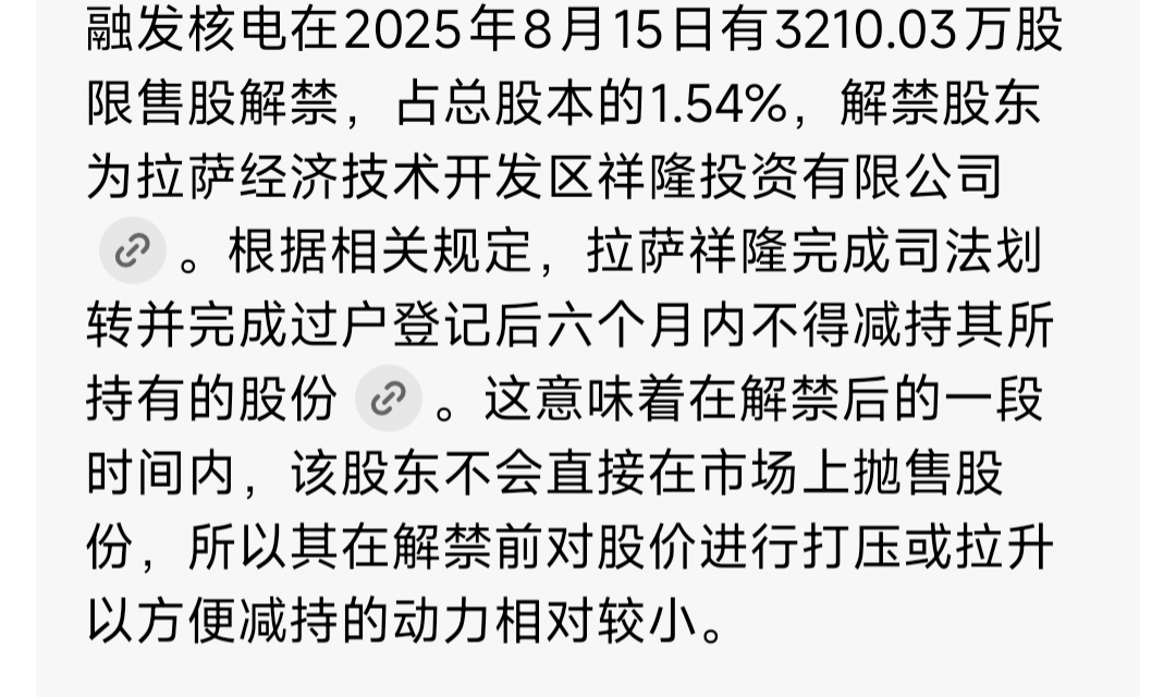 $融发核电(SZ002366)$ 解禁到底有什么影响?