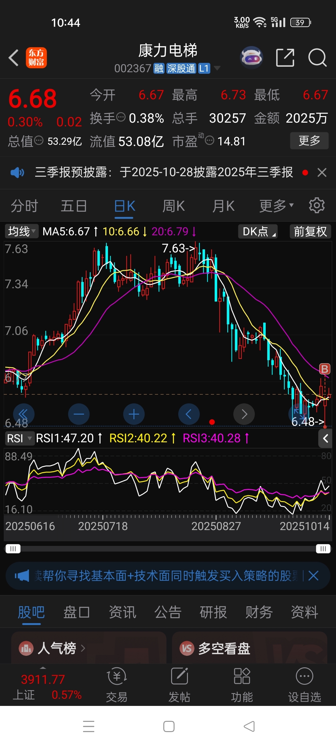 6.48买入了康力,虽然房产不行,但电梯是损耗品,财务各方面也健康,6.48这个