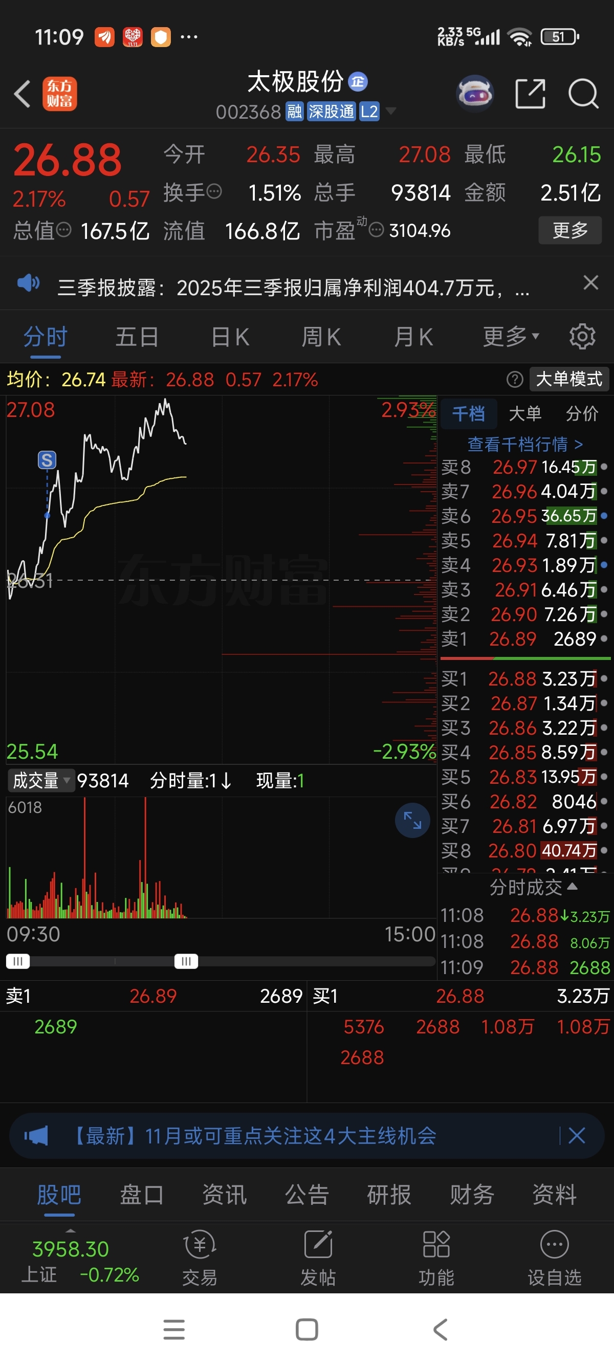 $太极股份(SZ002368)$  今天逆大盘而涨,是因为昨天无理跌多了吗? 嗯,我昨天尾盘买的,今天早盘卖早了点