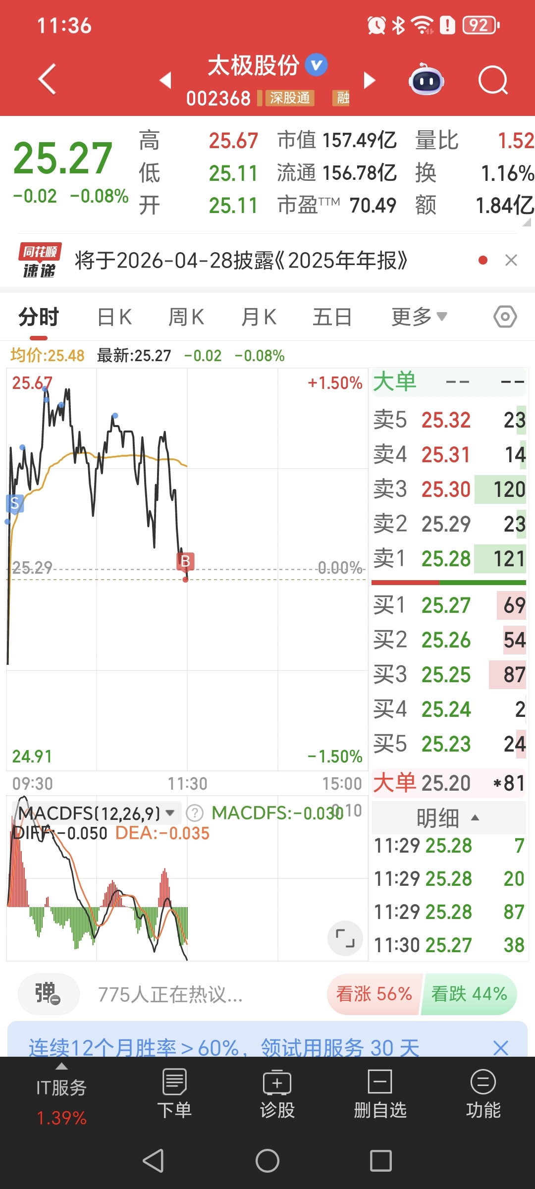 $太极股份(SZ002368)$ 减仓了好多!最近竟然没有反向操作!下面不懂什么位置接回来了