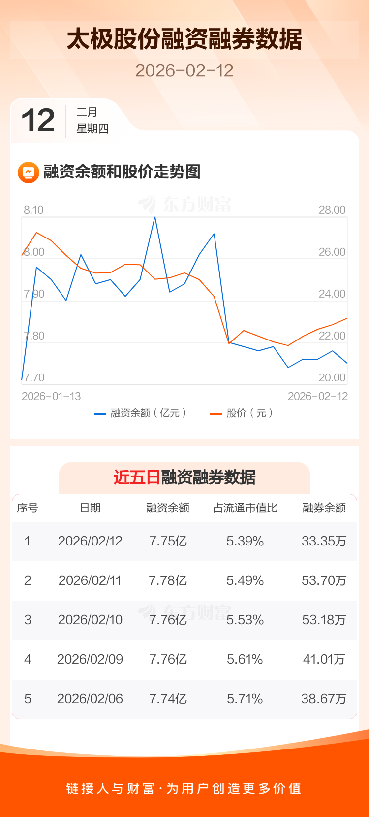 交易所最新数据显示,太极股份于2026年2月12日获融资买入1718.91万元,融资偿还2010.27万元,当日融资净偿还291.37万元。目前,该股融资余额7.75亿,占流通市值比例为5.39%。