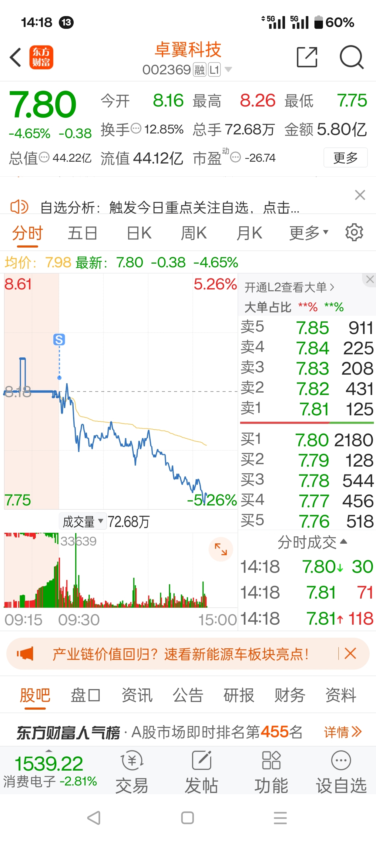 $卓翼科技(SZ002369)$ 单边下跌得股票,尾市卖出。跌破7.80考虑买入