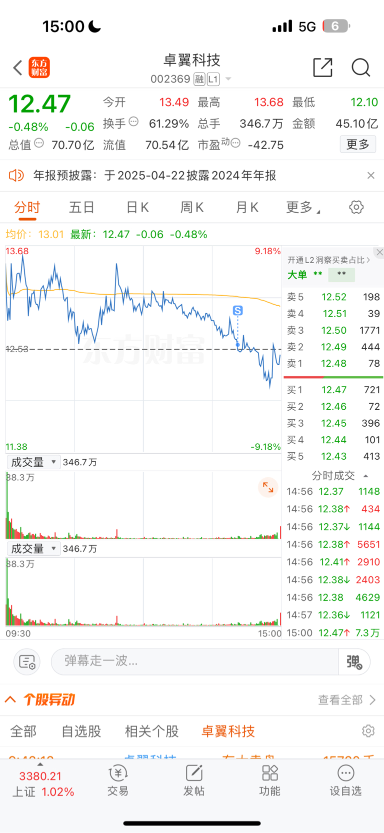 $卓翼科技(SZ002369)$ 这货不对劲,看了一眼业绩,马上又到三月份了,今天这种清仓式出货,有st的可能性,尾盘清了 祝好