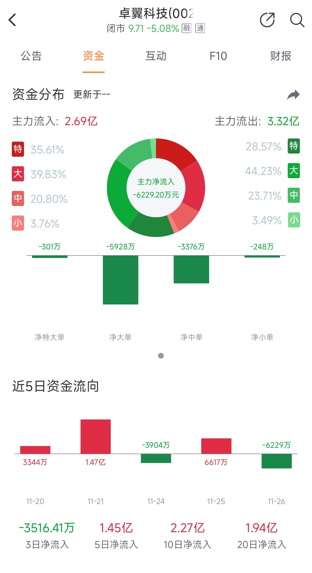 $卓翼科技(SZ002369)$ 今天是一个短期回调,前期部分获利盘离场,量能较前两日并未明显萎缩,但主力资金并未大量撤离且仍处于近5日的次高点,而换手率达到14%,反映主力可能趁股价大挫充分吸筹,明日看涨。