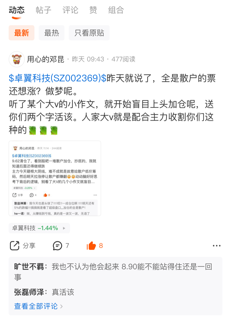和预想的一模一样哈哈,散户扎堆的股票务必远离,卓翼后面依旧是下跌趋势。跌到散户不
