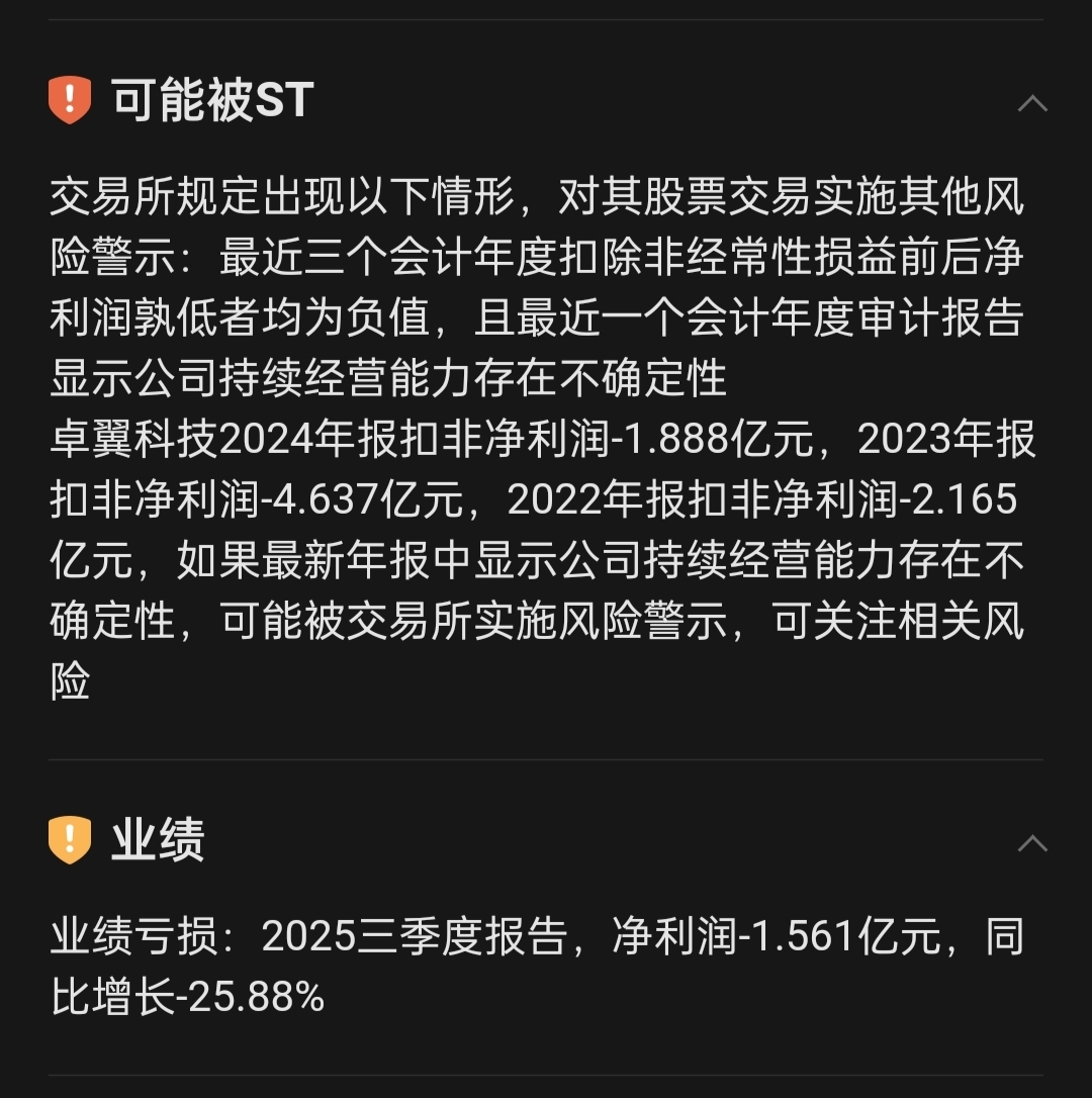 卓翼科技 公司预计2025年度经审计的净利润为负值且扣除与主营业务无关的业务收入和不具备商业实质的收入后的营业收入低于3亿元,年报披露后将出现《上海证券交易所股票上市规则》第9.3.7条规定情形,公司股票将面临被ST的风险。每10个交易日披露一次风险提示公告。