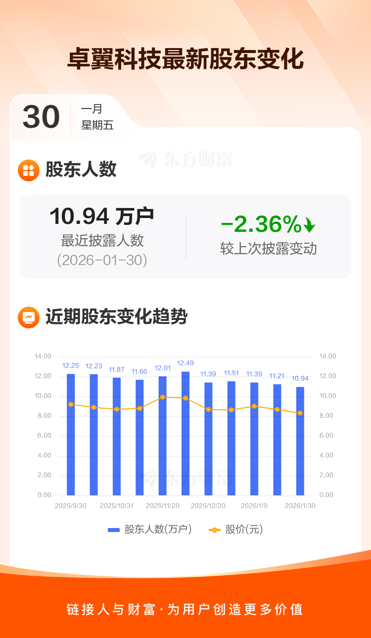 卓翼科技:截至1月30日最新股东户数10.94万户,较上期减少2.36%