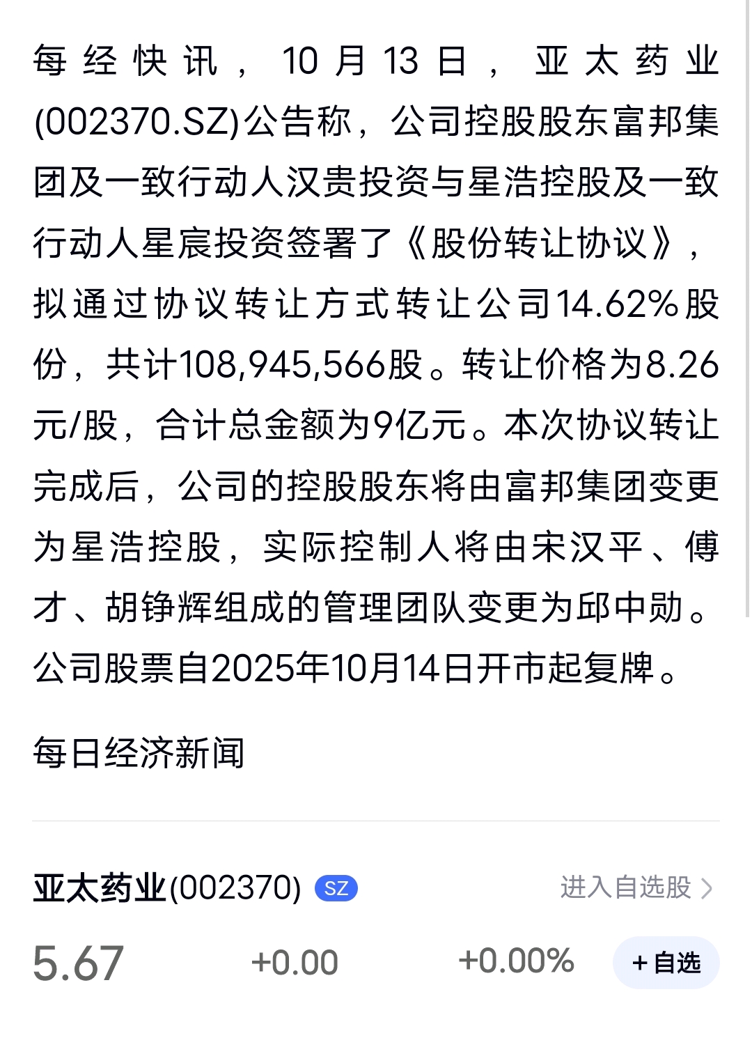 $亚太药业(SZ002370)$ 转让价格为8.26元/股 真假的?