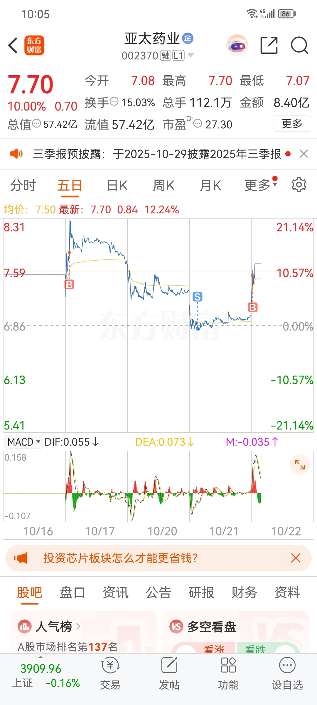 $亚太药业(SZ002370)$ 亏十个点,真秀