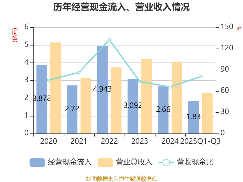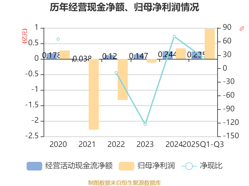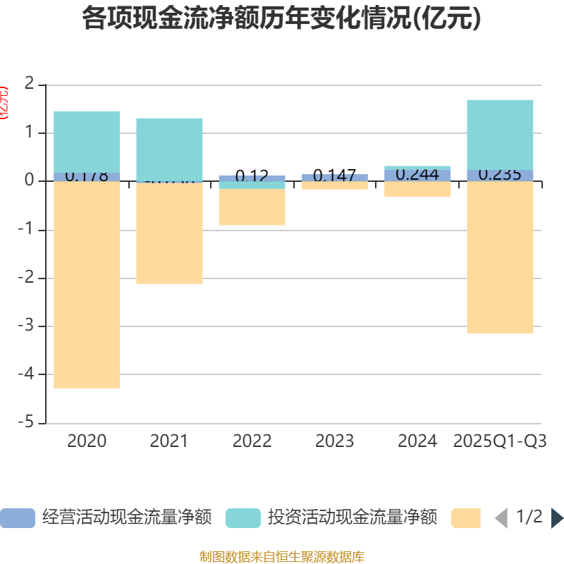 2025年前三季度,公司经营活动现金流净额为2354.9万元,同比下降34.35%;筹资活动现金流净额-3.15亿元,同比减少2.53亿元;投资活动现金流净额1.45亿元,上年同期为-510.73万元。