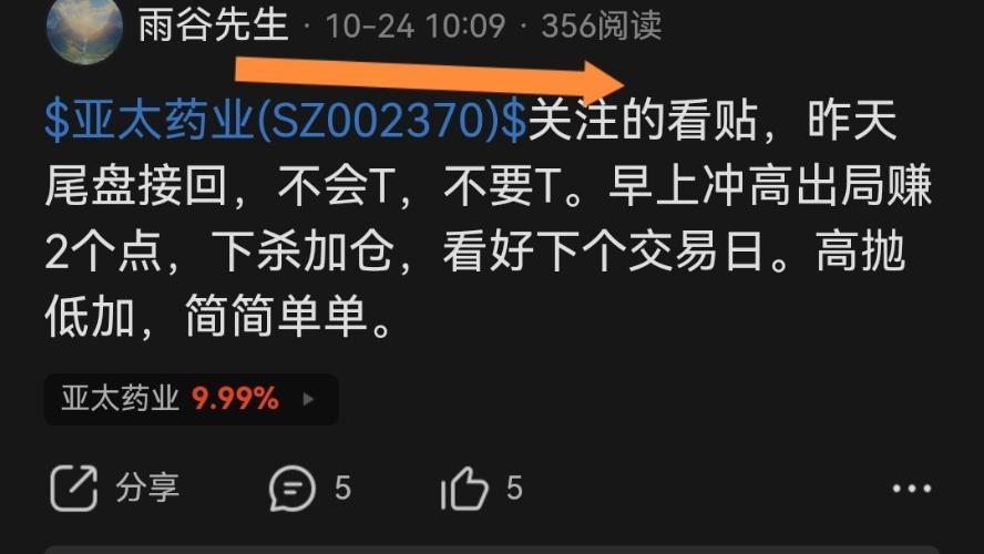 $亚太药业(SZ002370)$ 关注的股友多看贴,注意时间,没有关注的看缘份,错过了时空,亚大两连板,今天没有动,明天9.40没有封板可能减仓成底仓。