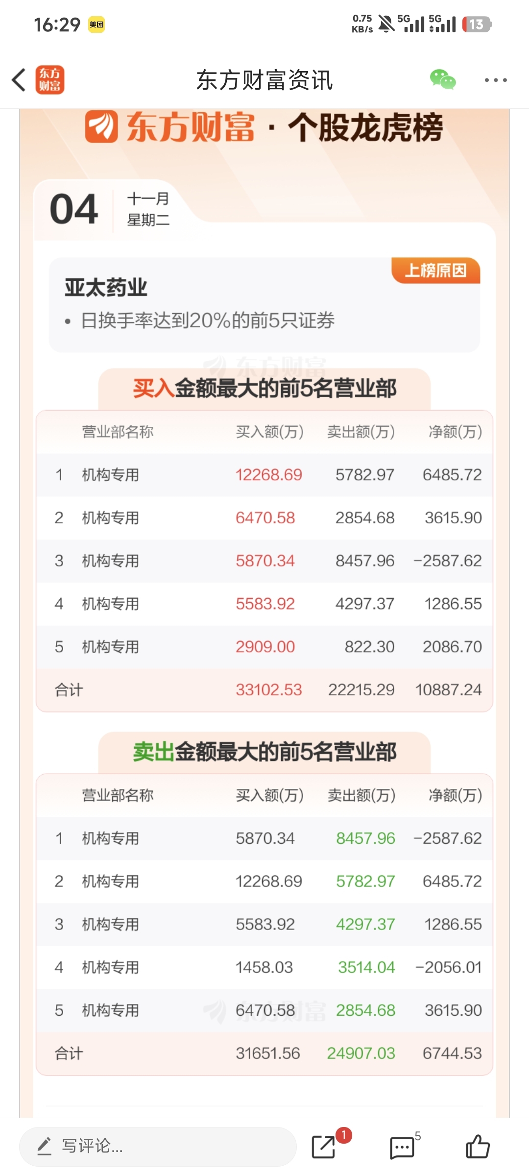 $亚太药业(SZ002370)$ 买卖一到五,全是机构,这么看好嘛?