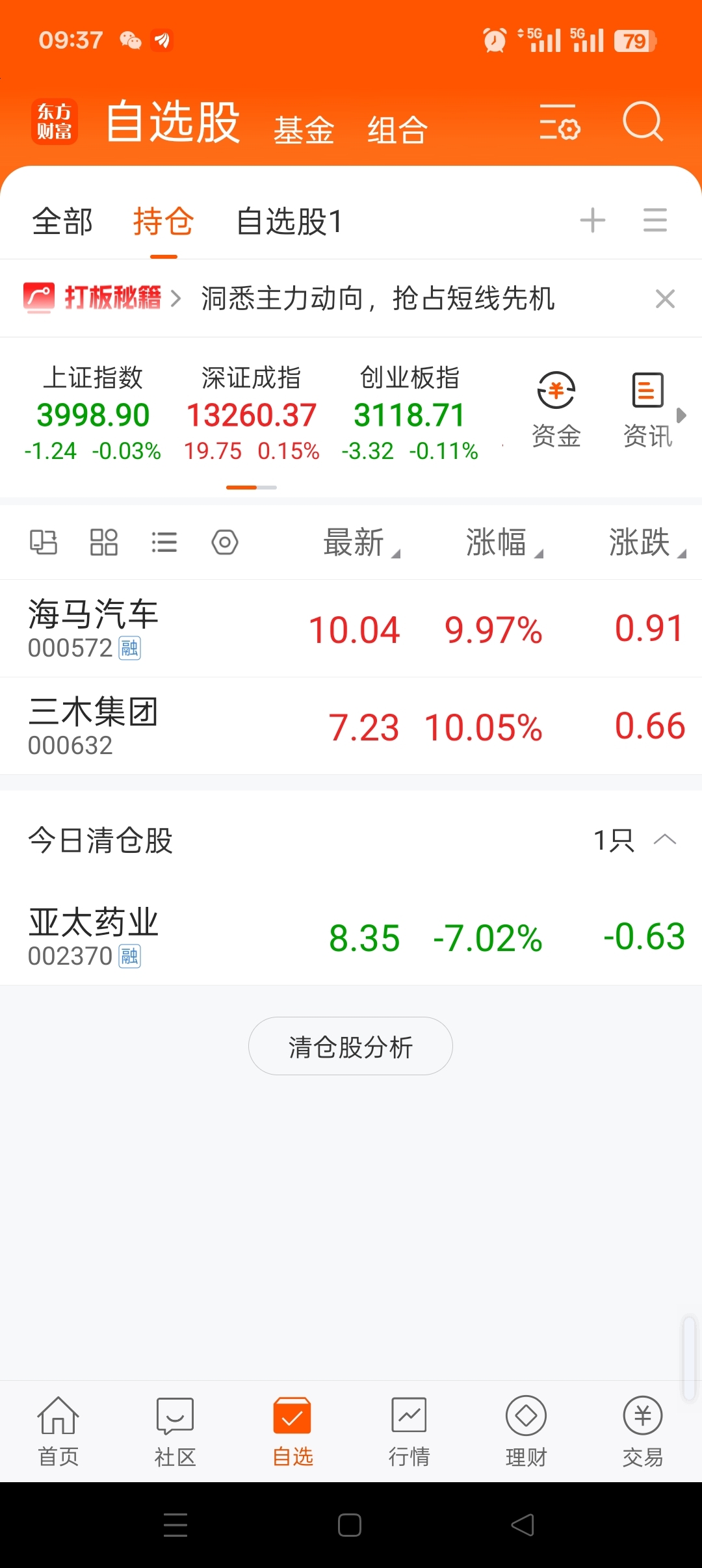 老规矩,隔夜单直接卖亚太。持有海马涨停,三木涨停