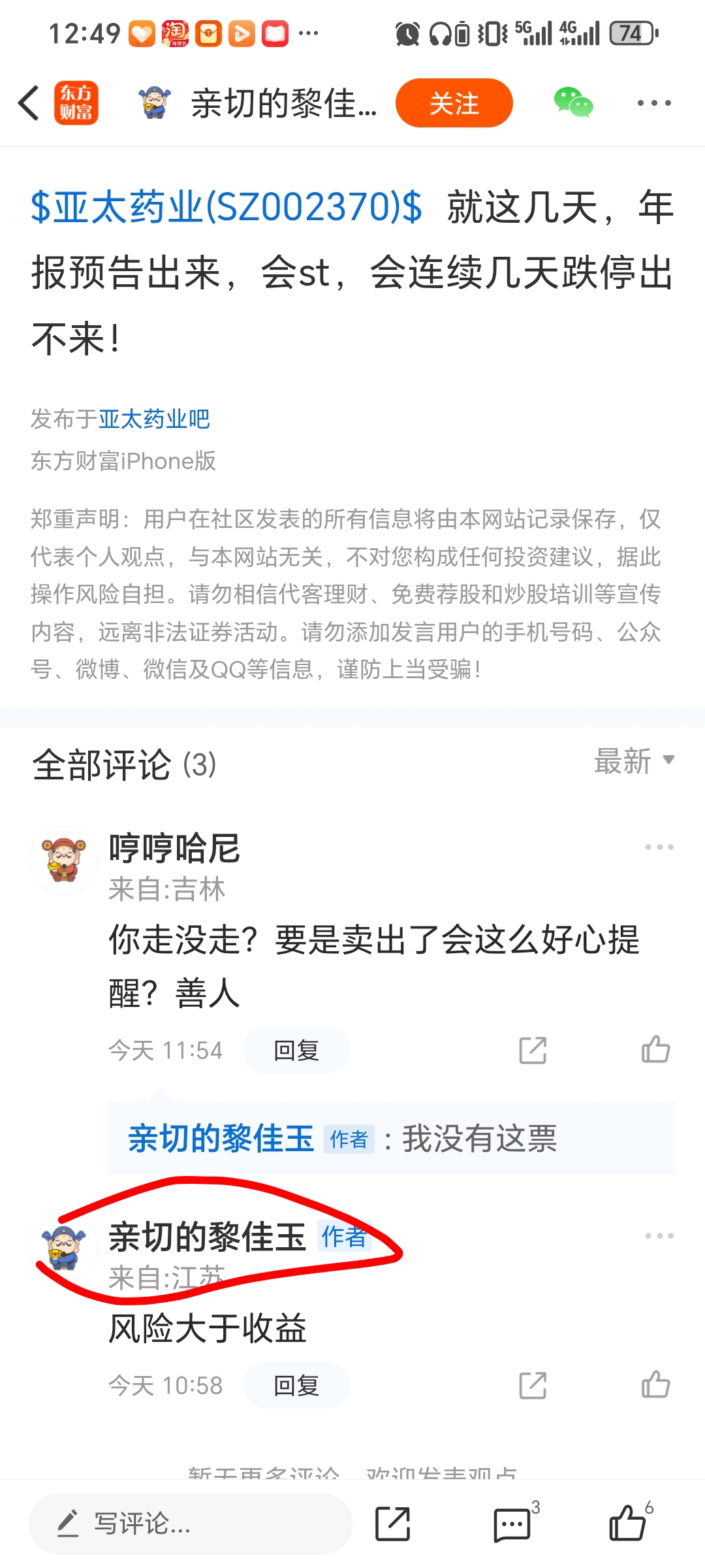 $亚太药业(SZ002370)$ 这人是个二臂,啥也不会就会瞎咧咧,出年报预告就会ST