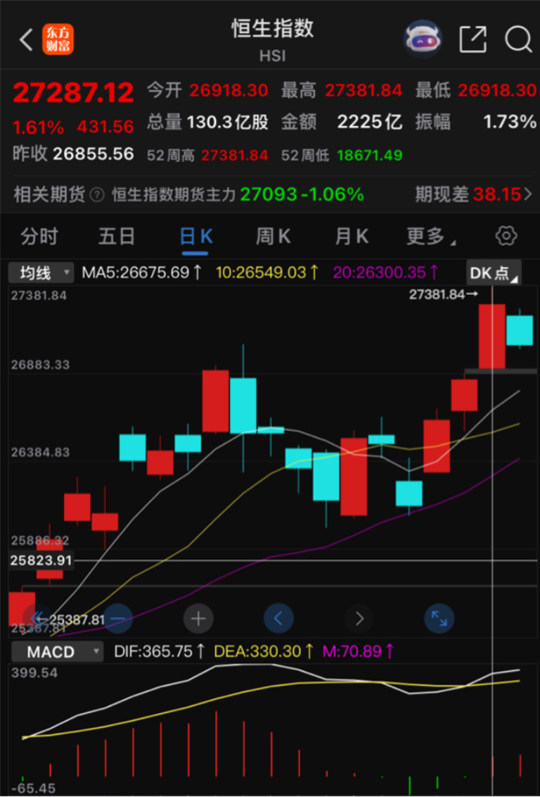 目前观察恒指今日为孕线结构,只要收盘这颗k线的上下影线在昨日的大阳线实体内.,确