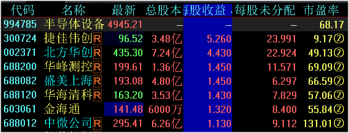 半导体设备 前7名PK: 每股收益、每股未分配、市盈率、投资价值