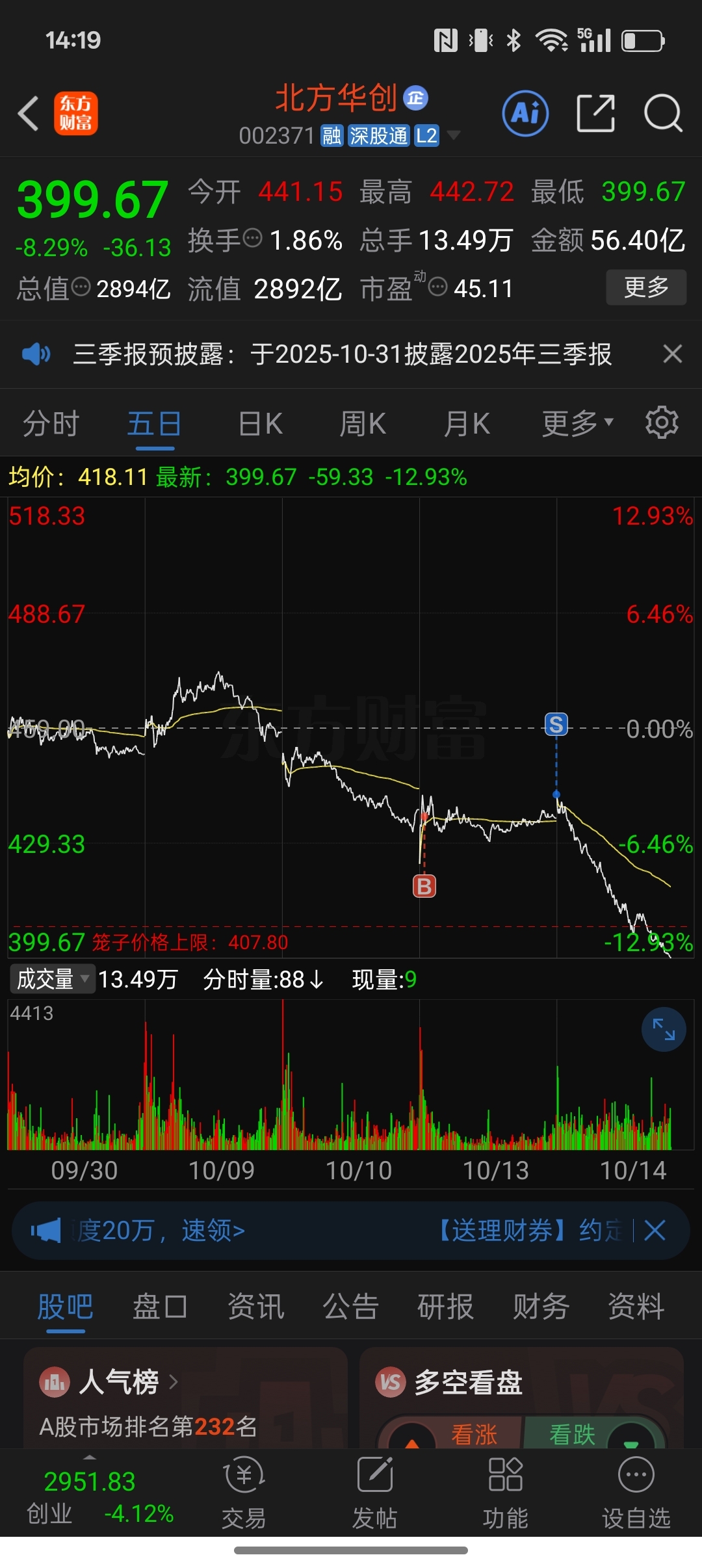 $北方华创(SZ002371)$ 犹豫一下就要亏损,做短失败