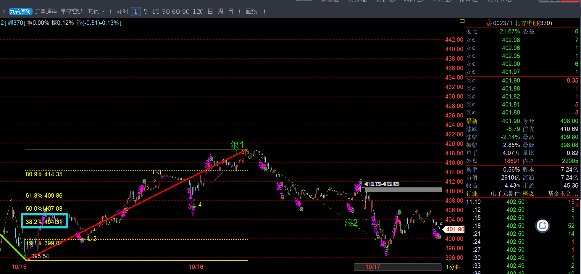 从395~4018分钟线走了5子浪,但修正波不该破位404.否则395.5要重新