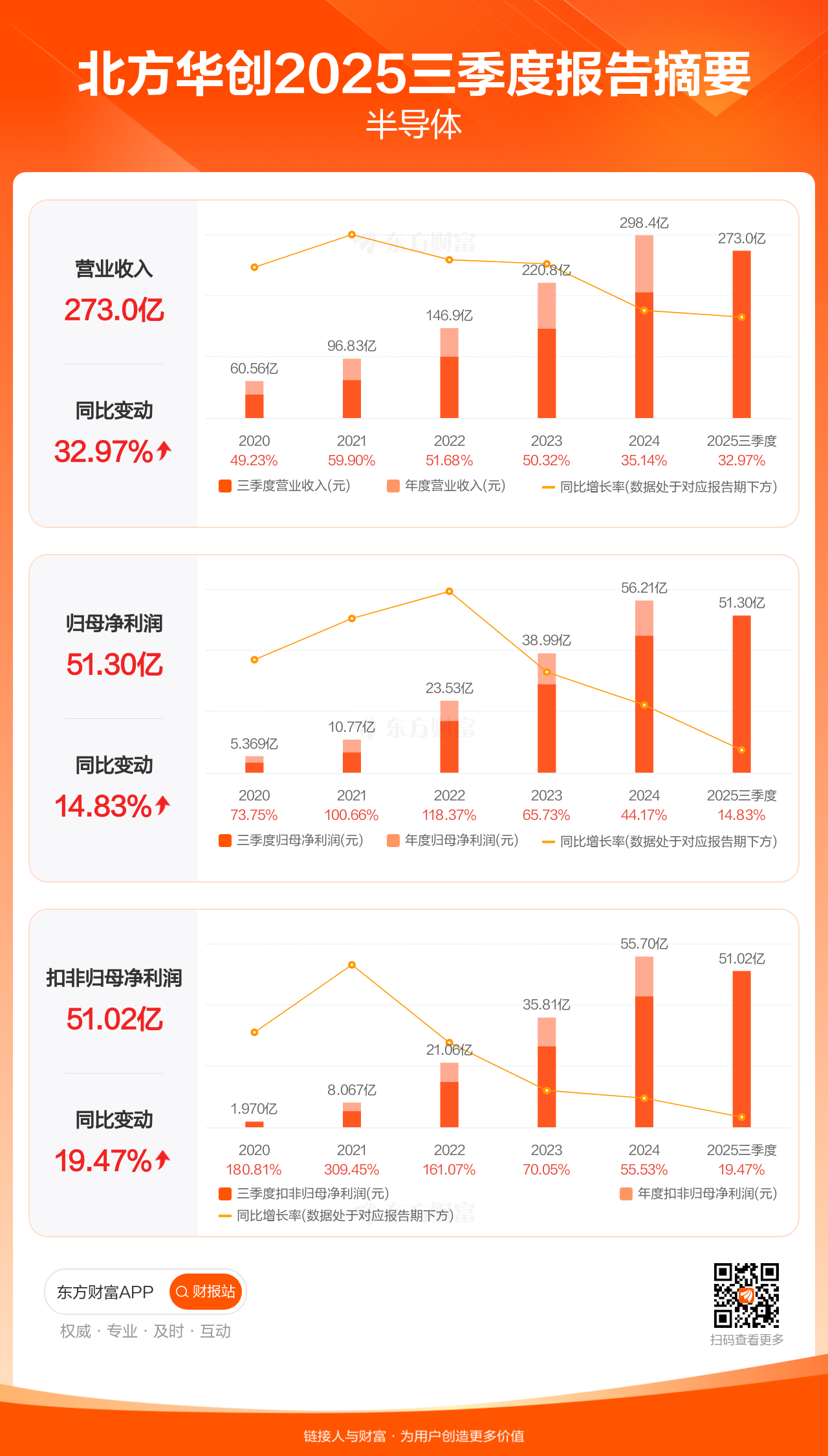 北方华创10月31日发布2025年三季报显示,公司前三季实现营业收入273.01亿元,同比增长32.97%;归母净利润51.30亿元,同比增长14.83%;扣非归母净利润51.02亿元,同比增长19.47%。
