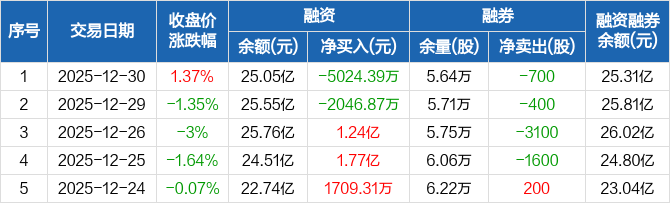 北方华创:融资净偿还5024.39万元,融资余额25.05亿元(12-30)