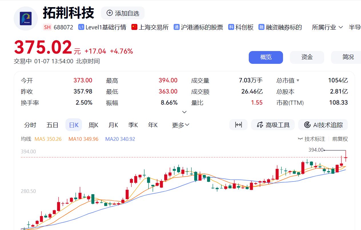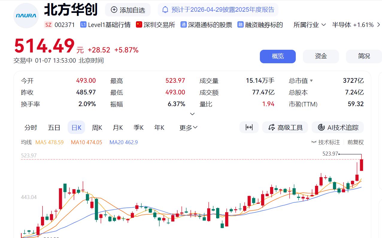 其中,半导体产业链走势最强,三大设备龙头股北方华创、中微公司、拓荆科技均大涨,盘中股价均创历史新高,存储芯片龙头股兆易创新盘中股价也创下历史新高,这4只个股总市值均超1000亿元。其中,北方华创一度涨超6%,截至发稿,北方华创涨近6%。