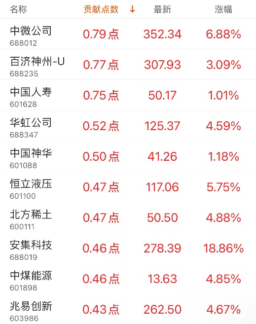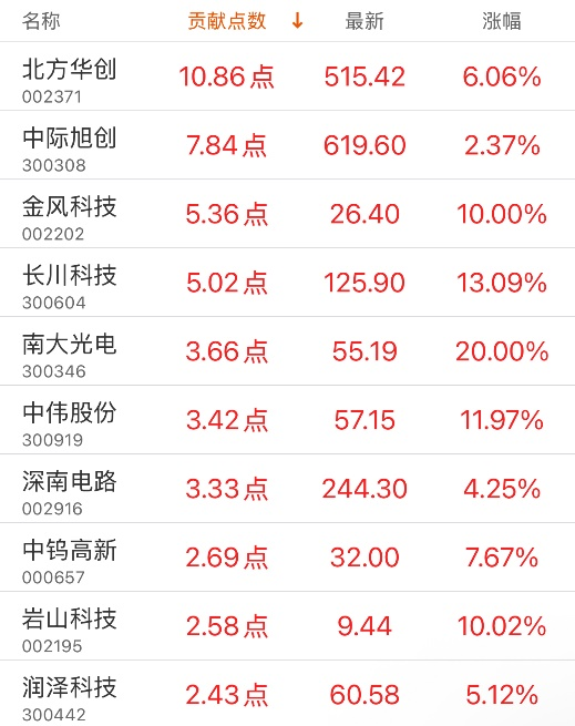 指数贡献榜:北方华创贡献10.86点