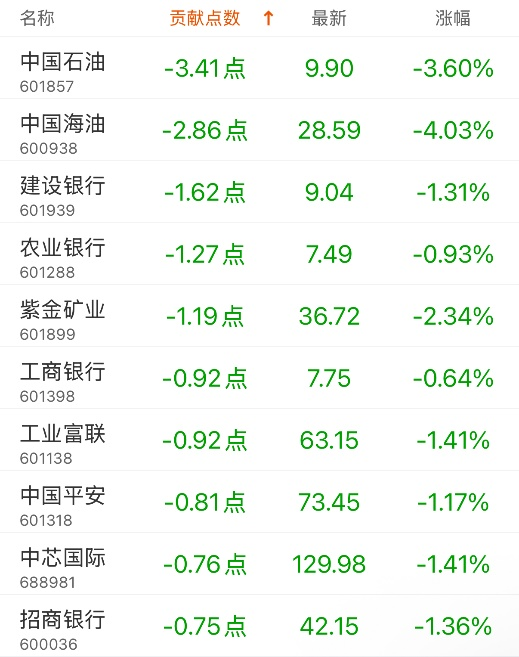 对上证指数贡献点数最多的个股是中微公司,贡献0.79点,该股当日涨6.88%,收盘价352.34元;拖累点数最多的个股是中国石油,拖累3.41点,该股当日跌3.6%,收盘价9.9元。