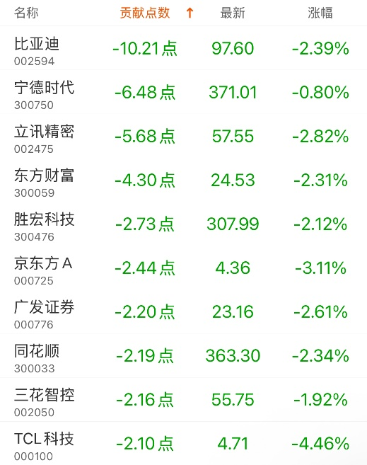 对深证成指贡献点数最多的个股是北方华创,贡献10.86点,该股当日涨6.06%,收盘价515.42元;拖累点数最多的个股是比亚迪,拖累10.21点,该股当日跌2.39%,收盘价97.6元。