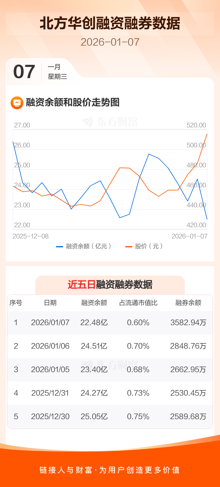 交易所最新数据显示,北方华创于2026年1月7日获融资买入4.95亿元,融资偿还6.98亿元,当日融资净偿还2.03亿元。目前,该股融资余额22.48亿,占流通市值比例为0.60%。