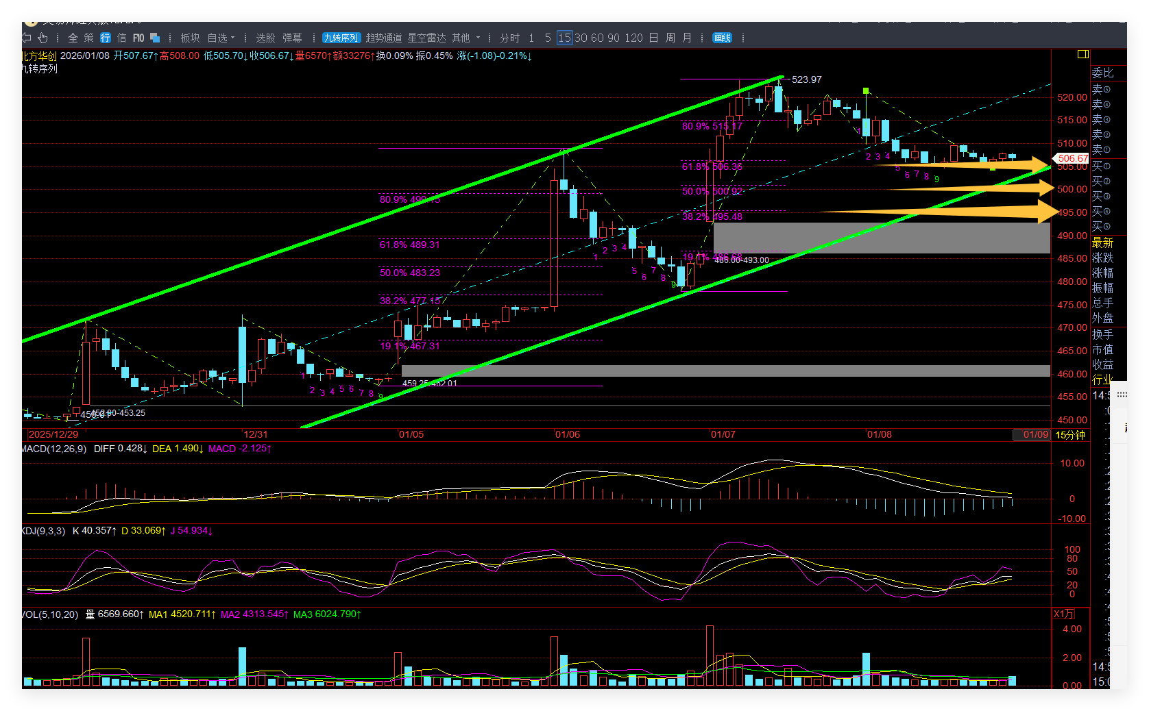 下方支撑位500.92(0.5位);195.48(0.618位)