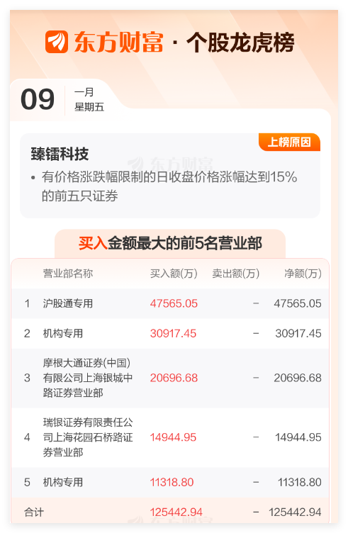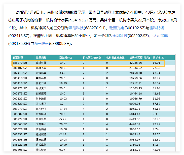 21智讯1月9日电,南财金融终端数据显示,因当日异动登上龙虎榜的个股中,40只沪深A股龙虎榜出现了机构的身影,机构合计净买入54193.21万元,具体来看,机构净买入22只个股,净卖出18只个股。其中,机构净买入前三分别为臻镭科技(688270.SH)、乾照光电(300102.SZ)与雷科防务(002413.SZ),详情见下图:机构净卖出的个股中,前三分别为金风科技(002202.SZ)、弘元绿能(603185.SH)与强一股份(688809.SH)。
