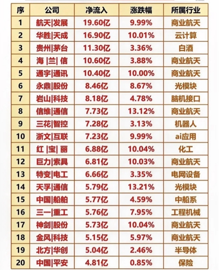 1. 航天发展:尾盘净流入19.60亿,涨9.99%,商业航天核心标的,受益低空经济与卫星互联政策,资金共振明显,需关注订单落地与产能释放,短期情绪催化强。