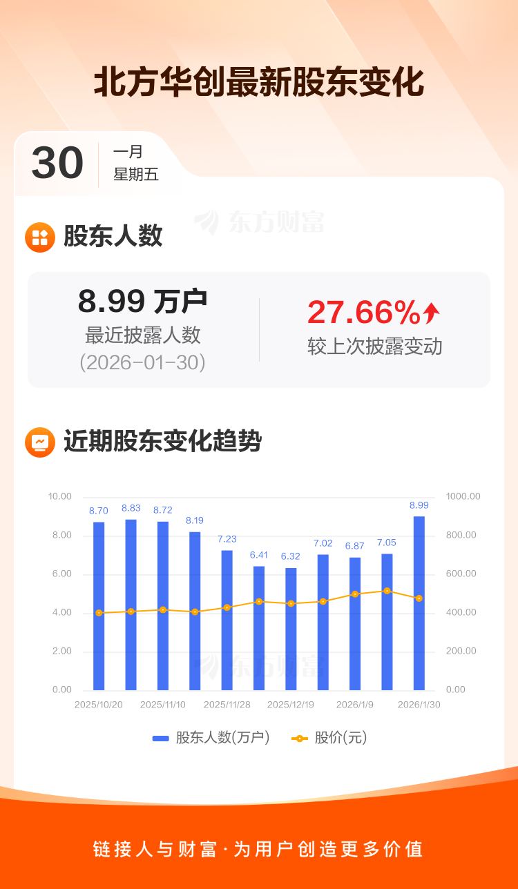 北方华创最新披露数据显示,截至1月30日公司股东户数为8.99万户,较上期(2026年1月20日)增加1.95万户,增幅为27.66%。户均持有流通股数量由上期的1.03万股下降至8047股,户均持股金额由上期的528.27万元减少至382.46万元。