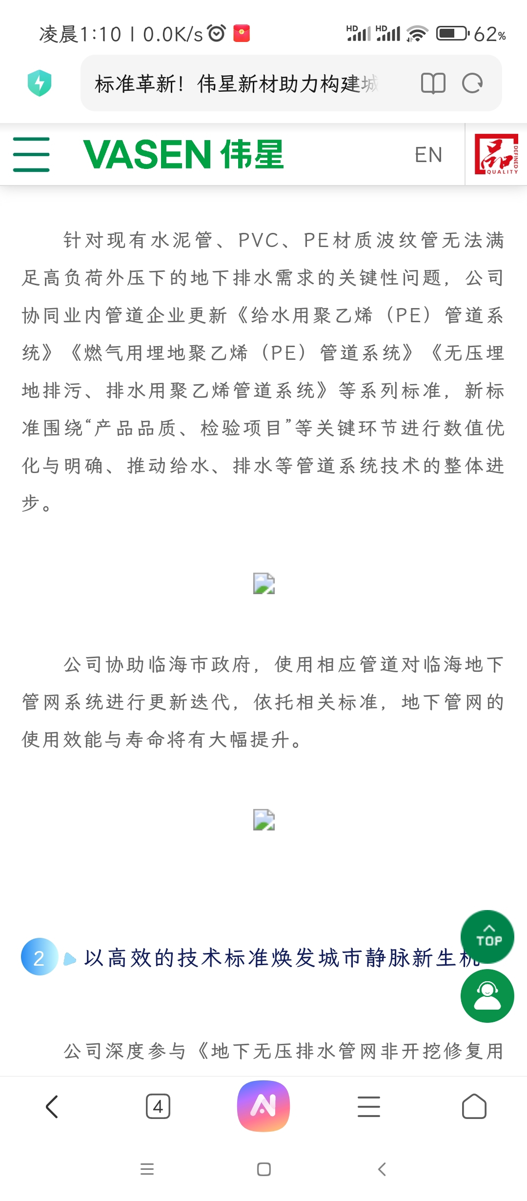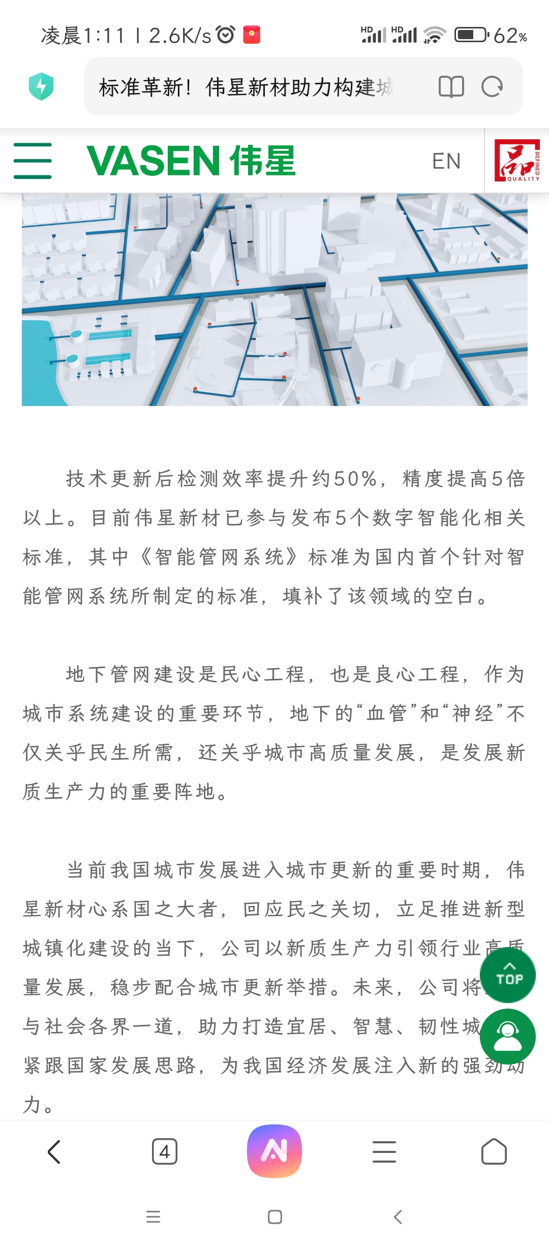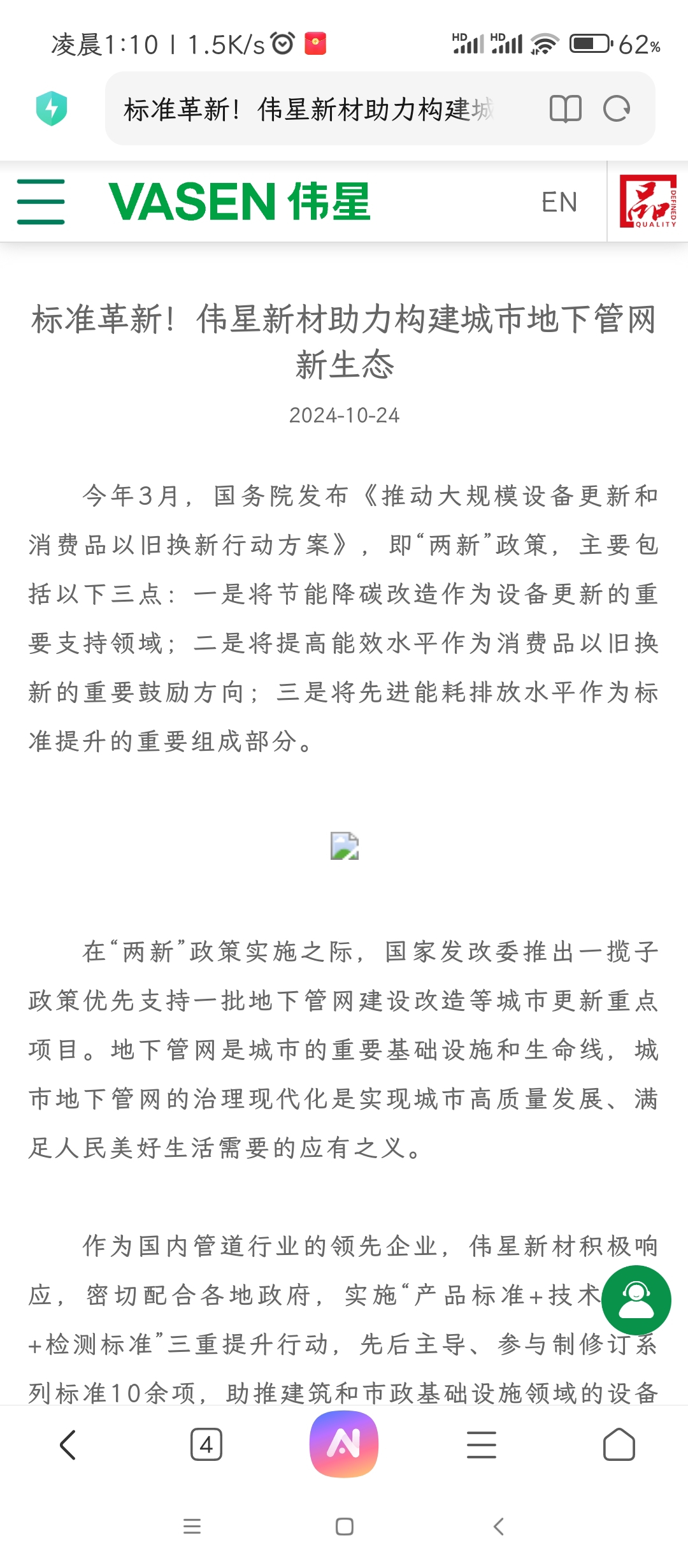作为国内管道行业的领先企业,伟星新材积极响应,密切配合各地政府,实施“产品标准+技术标准+检测标准”三重提升行动,先后主导、参与制修订系列标准10余项,助推建筑和市政基础设施领域的设备更新、老旧小区管道更新,构建城市“地下管网”新生态,以新质生产力助推城市“里子”工程建设。