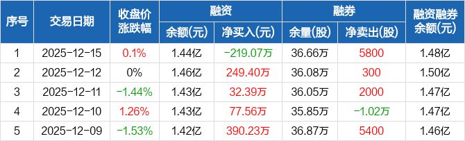 伟星新材:融资净偿还219.07万元,融资余额1.44亿元(12-15)